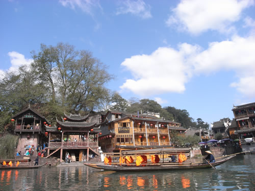 凤凰沱江河 顺水而下,穿过虹桥一幅江南水乡的画卷便展现于眼前:万寿宫、万名塔、夺翠楼……一种远离尘世的感觉悠然而生。沱江的南岸是古城墙,用紫红沙石砌成,典雅不失雄伟。城墙有东、北两座城楼,久经沧桑,依然壮观。沱江河水清澈,城墙边的河道很浅,水流悠游缓和,可以看到柔波里招摇的水草,可以撑一支长篙漫溯。