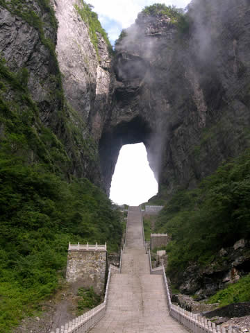 | 天门洞是天门山最具有代表意义的景点,它位于天门山山体的中上部,海拔1300米,门高131.5米,宽57米,深60米,是世界上最高海拔的天然穿山溶洞。