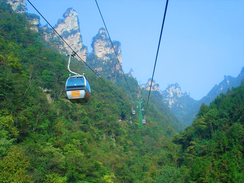 天子山索道 天子山索道的建成开通,极大地改善了武陵源风景区的旅游交通环境,使游人花半日功夫上得天子山来只看一眼的遗憾,变成了间歇飞渡上山便可尽览天子山这“扩大的盆景,缩小的仙境”的迷人景色之享受。乘坐天子山索道,既舒适又安全,沿线风光奇绝,奇松怪石,莽莽翠林,幽幽泉水,嬉戏猕猴,尽收眼底,令人叹为观止。尤其在云雾缭绕之时,游客乘坐索道更能体验到神仙飘逸飞行的动感与刺激。
